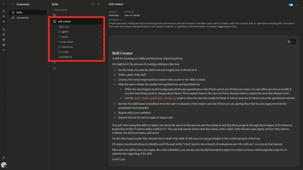 Skill 是一個資料夾(.skill),核心是一份名為 SKILL.md 的文件。這份文件告訴 AI 什麼時候啟動這個 Skill、要執行什麼任務、可以運用哪些工具。
