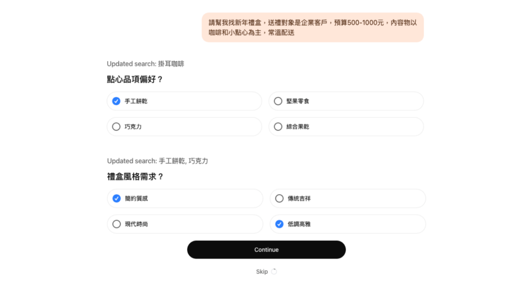 當你提出購物需求後,系統會透過互動式提問來進一步釐清重點,例如: