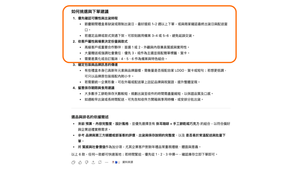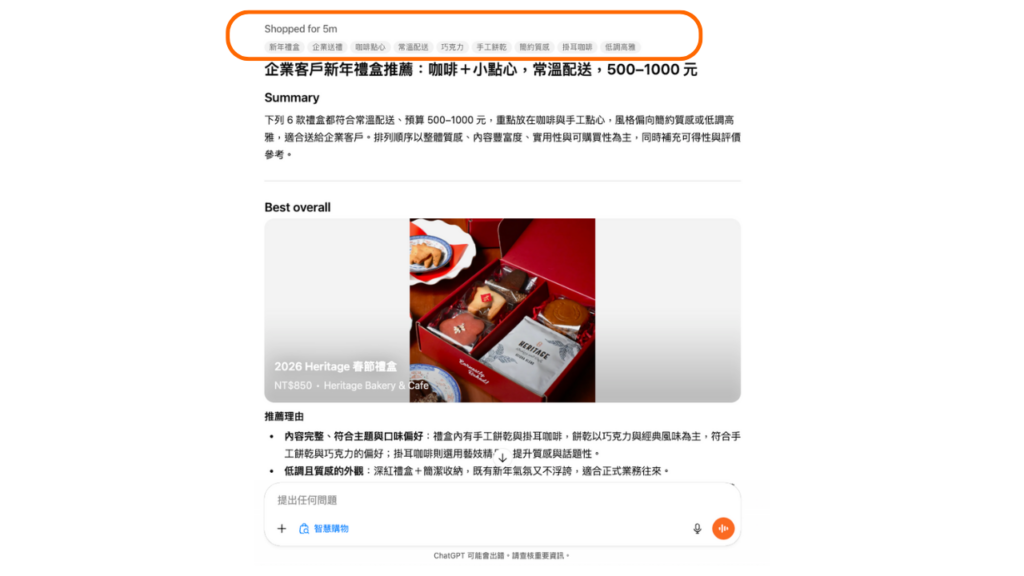 適逢新年佳節,企業送禮總需貨比三家,尋覓符合預算以及公司品牌風格的禮盒,使用 ChatGPT「智慧購物」功能可省下在各個平台網頁切換比對的時間,輕鬆取得符合需求的選項與建議。