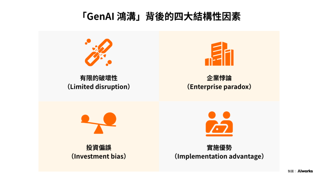 這些現象共同形成 MIT 所稱的 「GenAI 鴻溝」,意指「高投入」和「低回報」間出現的巨大斷層。